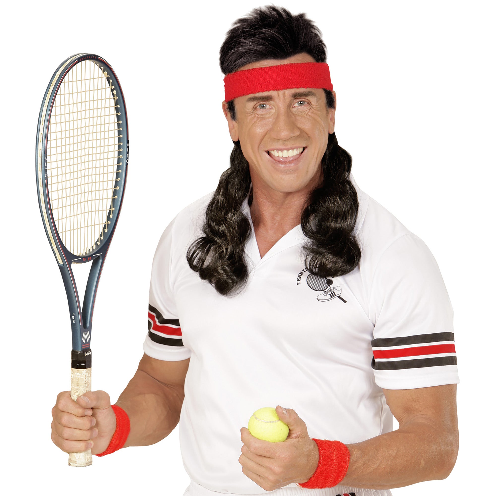 bandeau cheveux mulet noir, perruque mulet noire, accessoire années 80, déguisement rock, bandeau rouge perruque, look rétro homme