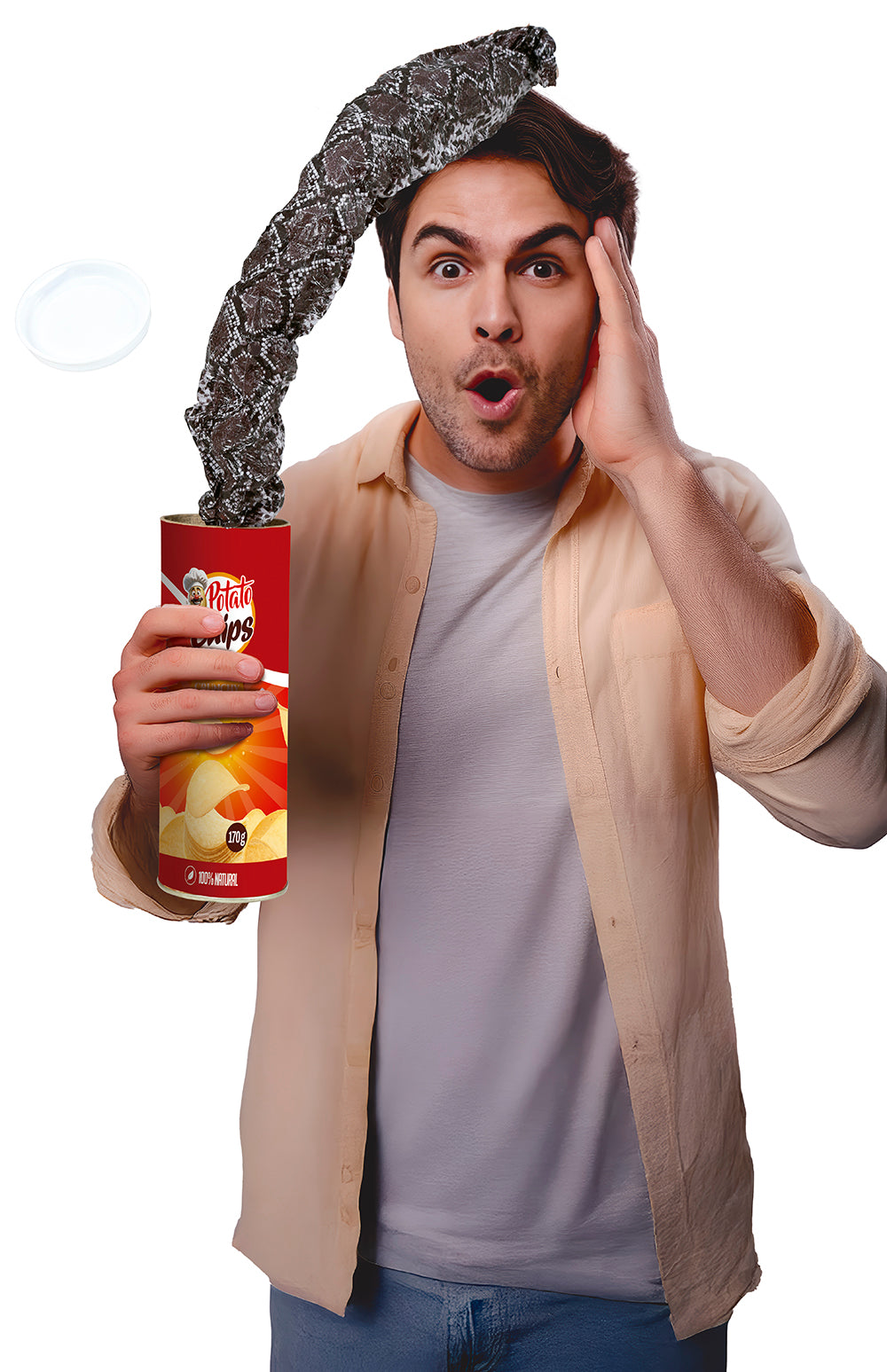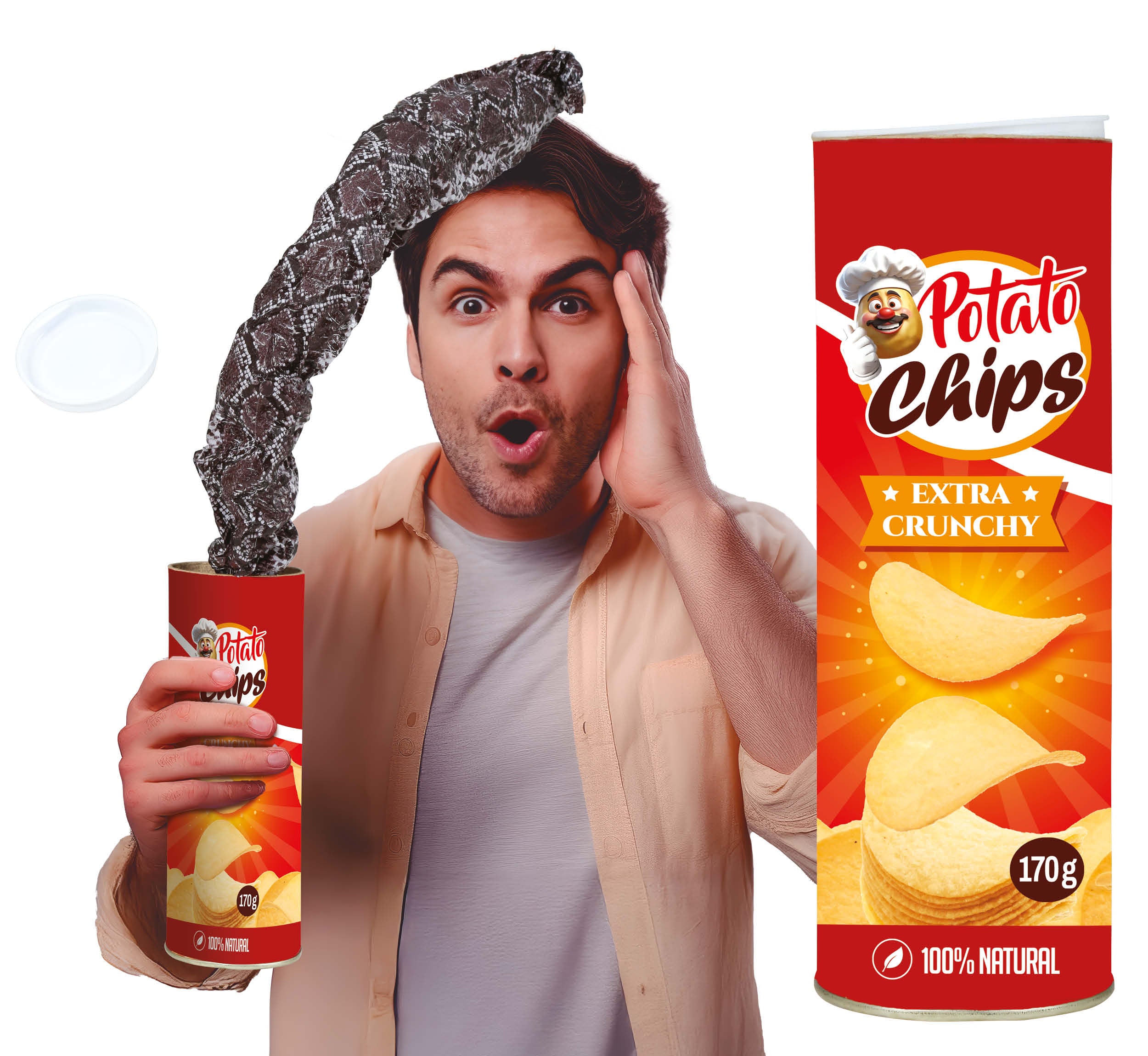 Faites rire et sursauter vos invités en un instant avec cette boîte de chips qui cache une bonne farce. À première vue, c’est un pot de chips comme un autre… mais dès qu’on soulève le couvercle, un ressort dissimulé libère un serpentin sautillant qui bondit hors de la boîte ! Un classique des blagues qui fonctionne à coup sûr lors des soirées, anniversaires, enterrements de vie de célibataire ou réunions entre amis.