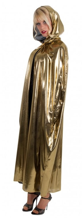 Confectionnée dans un tissu à l’aspect métallique, cette cape offre un rendu lumineux et saisissant qui capte la lumière à chaque mouvement. Sa capuche intégrée renforce l’effet dramatique et permet d’incarner facilement un personnage mystérieux, magique ou héroïque.