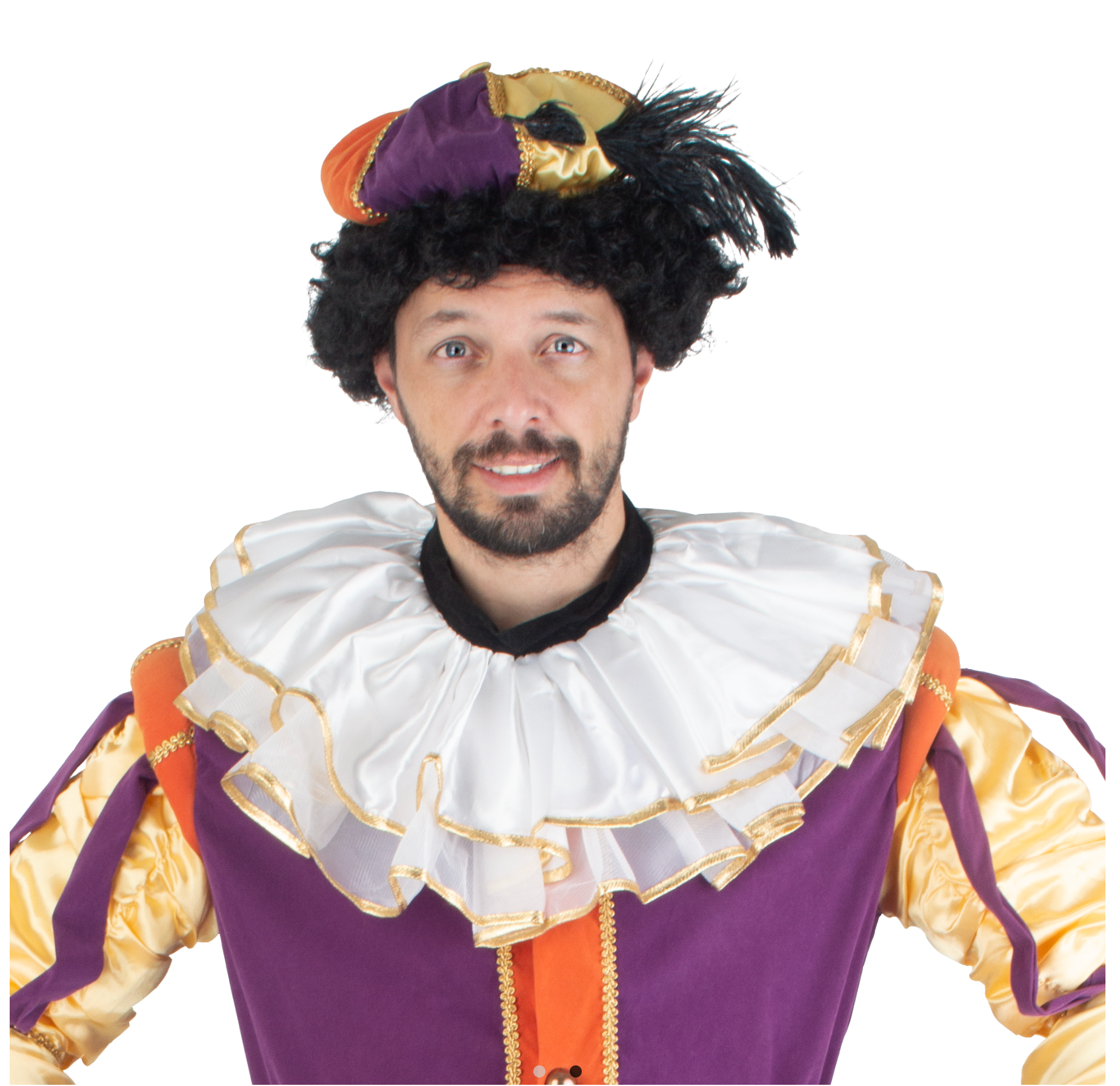 Confectionné en tissu plissé, ce col blanc met en valeur le port de tête avec sa forme ample et structurée. Les galons dorés soulignent son élégance, idéale pour un personnage de roi, reine, noble ou artiste de théâtre.