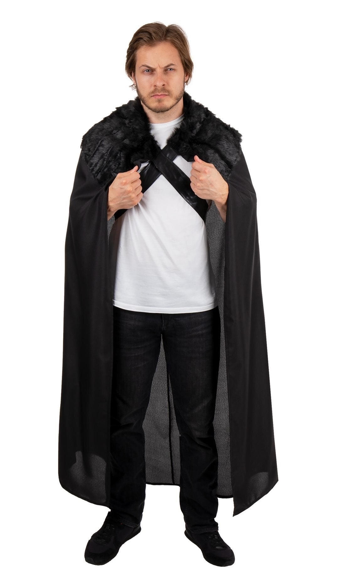 Affirmez votre allure de preux chevalier ou de mystérieux voyageur du Moyen Âge avec cette cape médiévale noire, longue et élégante, rehaussée de fausse fourrure (moumoute) sur le col et les épaules. Fabriquée en tissu épais et résistant, elle garantit une tenue impeccable et confortable pour vos soirées costumées, jeux de rôle ou événements historiques. Les lacets sur le devant permettent d’ajuster parfaitement la cape à votre morphologie et assurent un maintien sûr durant toutes vos aventures. Idéale pour parfaire un costume de chevalier, sorcier ou personnage fantastique !