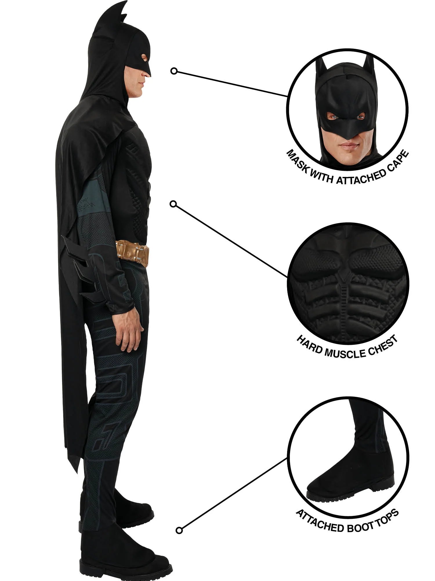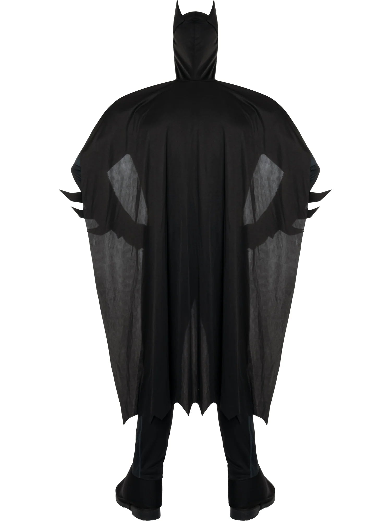Le costume se compose d’une combinaison avec torse 3D sculpté pour un effet musclé réaliste, d’une paire de sur-bottes, d’une ceinture emblématique et d’une cape majestueuse accompagnée du masque de Batman. Chaque élément contribue à créer une silhouette fidèle au personnage et immédiatement reconnaissable.