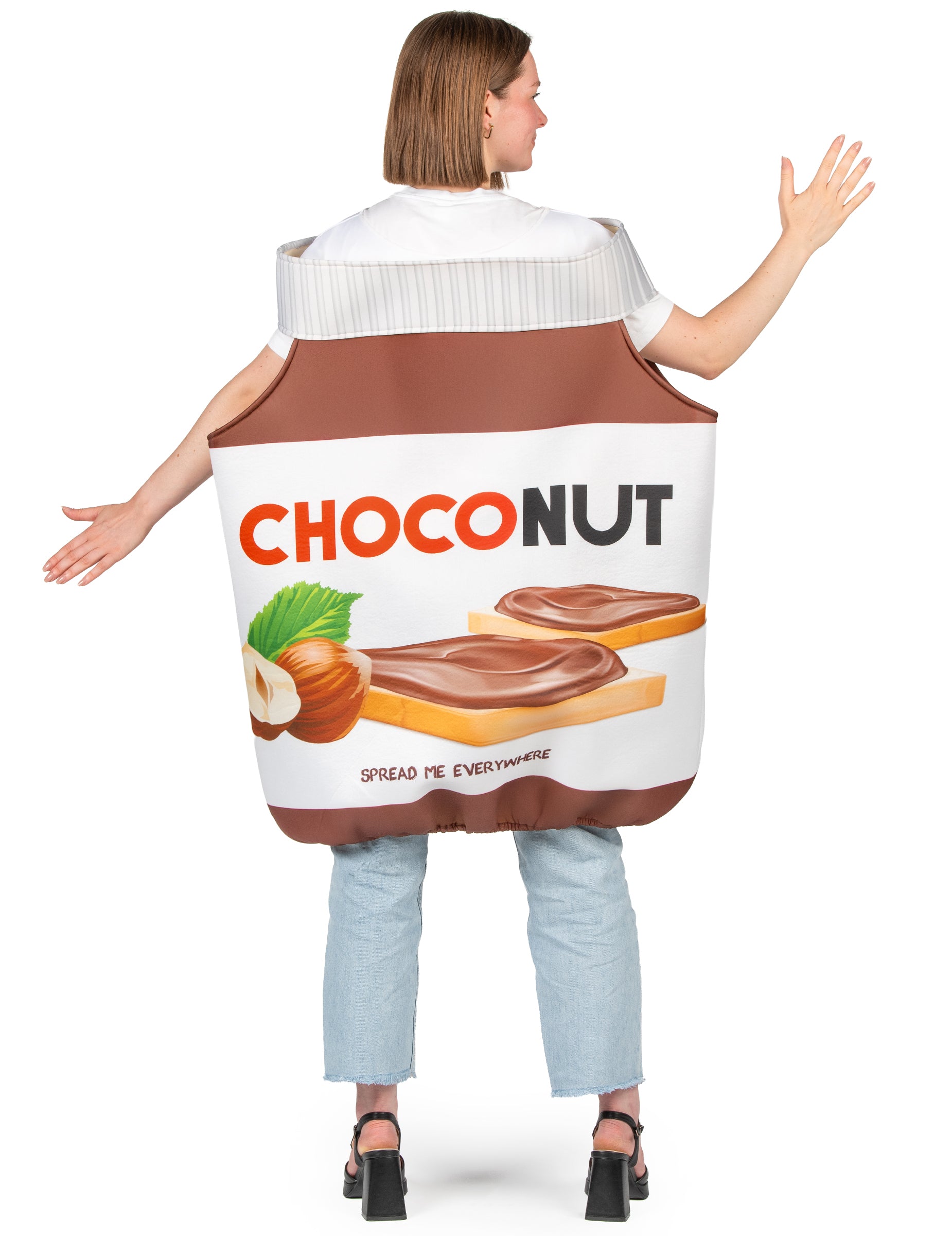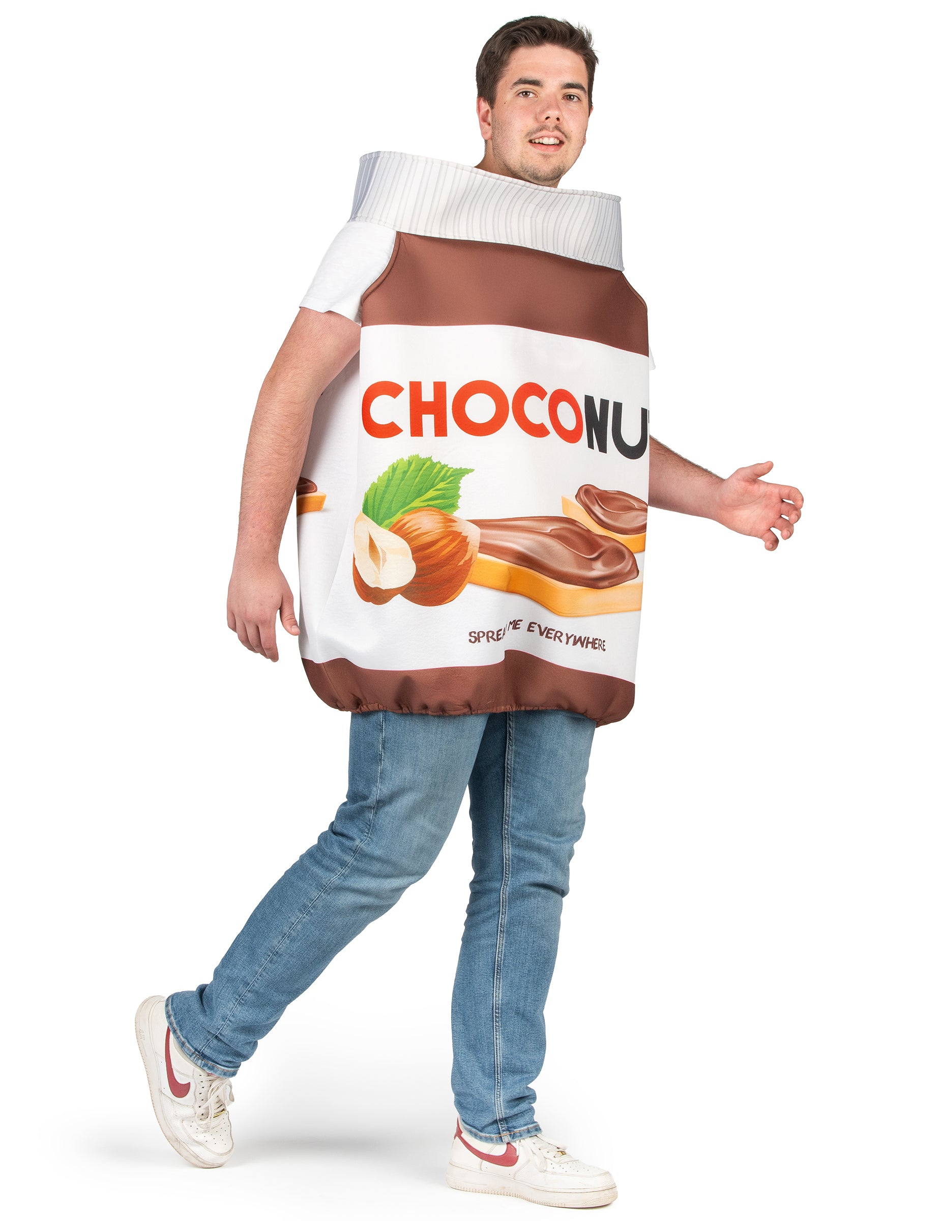 Conçu en mousse légère, ce costume Choconut reprend fidèlement la forme emblématique d’un pot de pâte à tartiner. L’impression détaillée met en scène des tartines nappées, des noisettes et un visuel iconique, tandis que le col effet opercule argenté accentue l’illusion d’un pot fraîchement ouvert.