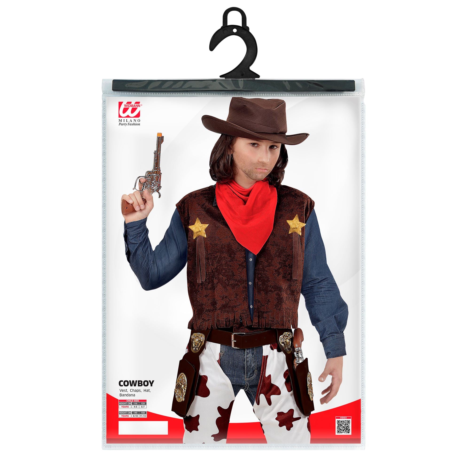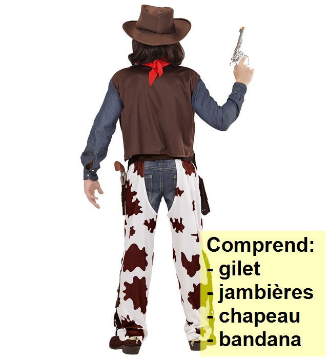 Costume cowboy enfant avec gilet, chaps, bandana et chapeau. Idéal pour un look western et héros du Far West. Achetez-le maintenant sur notre site web.