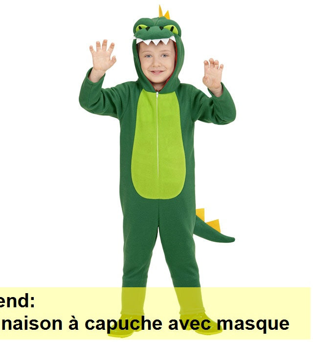 Déguisement dragon/dinosaure pour enfant avec combinaison verte, queue et écailles. Parfait pour fêtes, anniversaires et carnaval. Achetez-le maintenant sur notre site web.