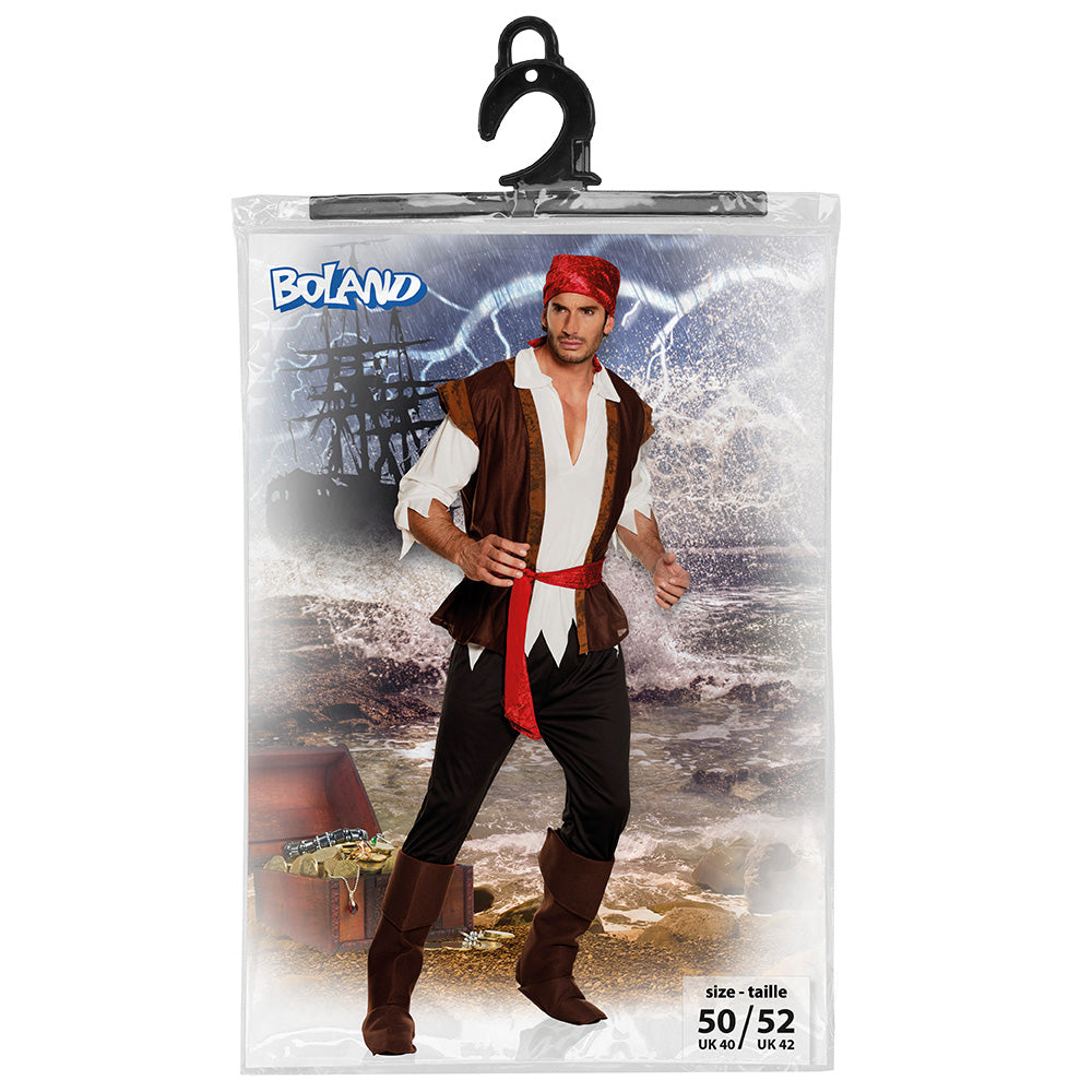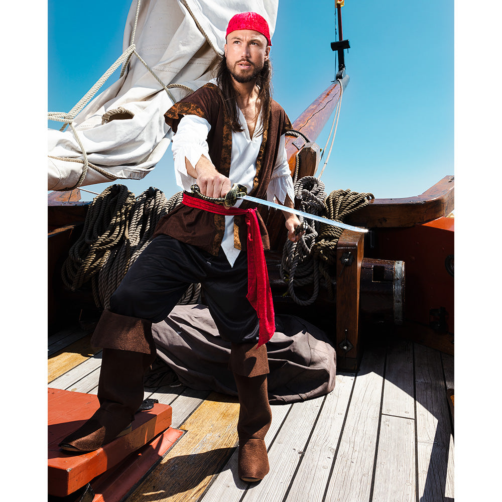 Embarquez pour une aventure légendaire avec ce costume de pirate des Caraïbes pour homme, composé d'une chemise, d'un gilet, d'un pantalon, d'un foulard, d'une ceinture et de cache-bottes. Disponible en tailles XS à XXL, cette tenue complète allie authenticité et confort pour incarner un corsaire aussi charismatique que redoutable. Parfait pour Halloween, soirées à thème, carnavals et spectacles, ce déguisement vous plongera dans l'univers des grands flibustiers.