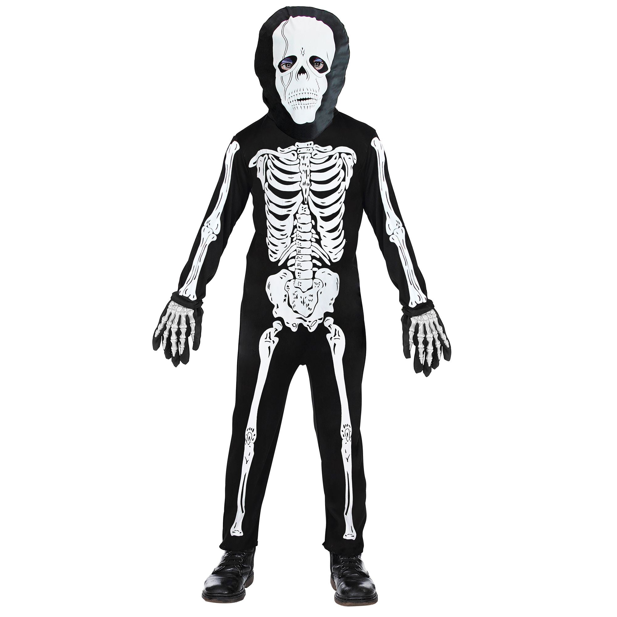 Le costume se compose d’une combinaison noire imprimée d’os réalistes et d’une cagoule assortie, créant un effet terrifiant parfait pour surprendre amis et voisins lors de la chasse aux bonbons. Léger et confortable, il permet de bouger et de jouer librement tout en restant dans l’esprit d’Halloween.