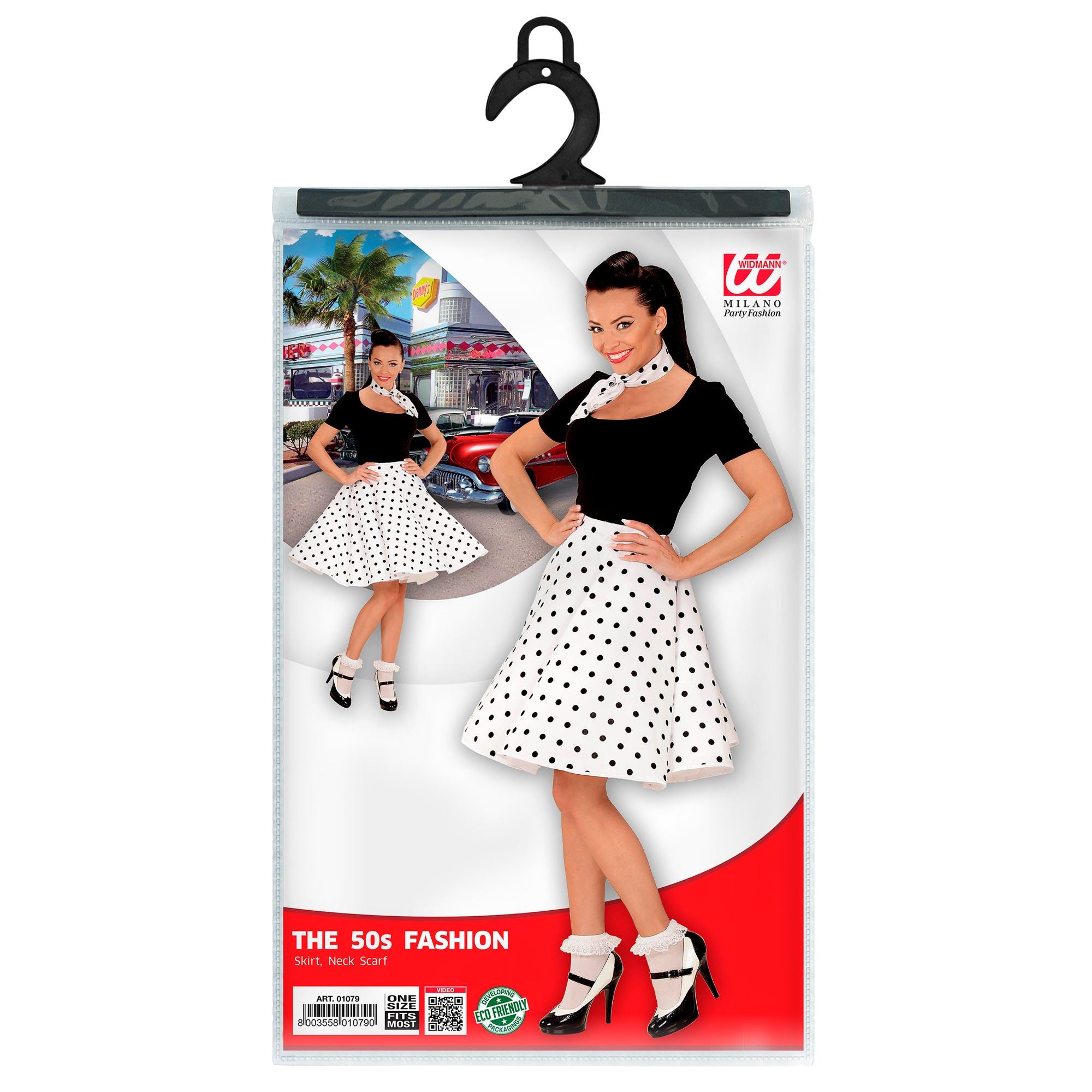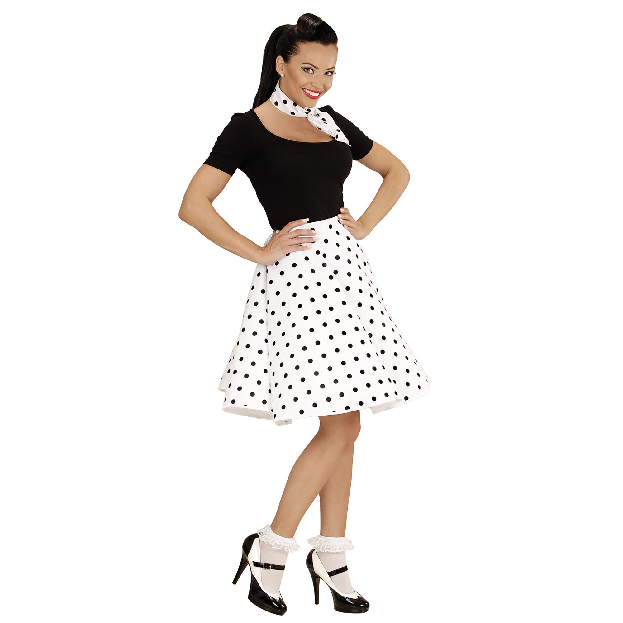 Adoptez le style rétro des années 50 et 60 avec cet ensemble chic composé d’une jupe blanche à pois noirs et d’un foulard assorti. La jupe évasée, emblématique du style rockabilly, offre une silhouette féminine et élégante, tandis que le foulard à nouer autour du cou complète parfaitement le look pin-up années 50.