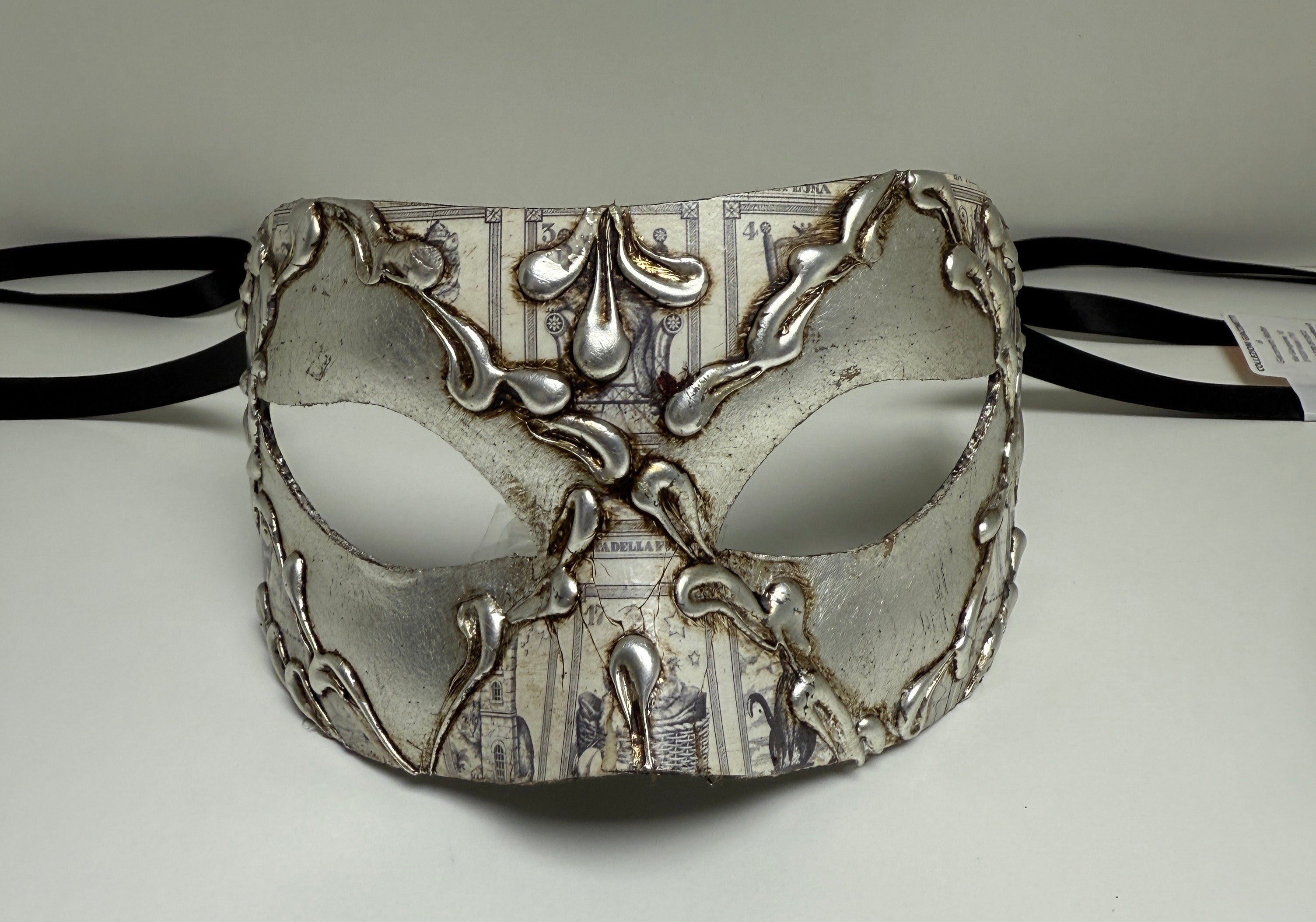 Plongez dans l’univers envoûtant du Carnaval de Venise avec ce loup civette vénitien décoré d’argent, une pièce à la fois mystérieuse et sophistiquée. Son design finement travaillé évoque l’élégance des masques traditionnels, sublimé par des ornements argentés aux reflets délicats.