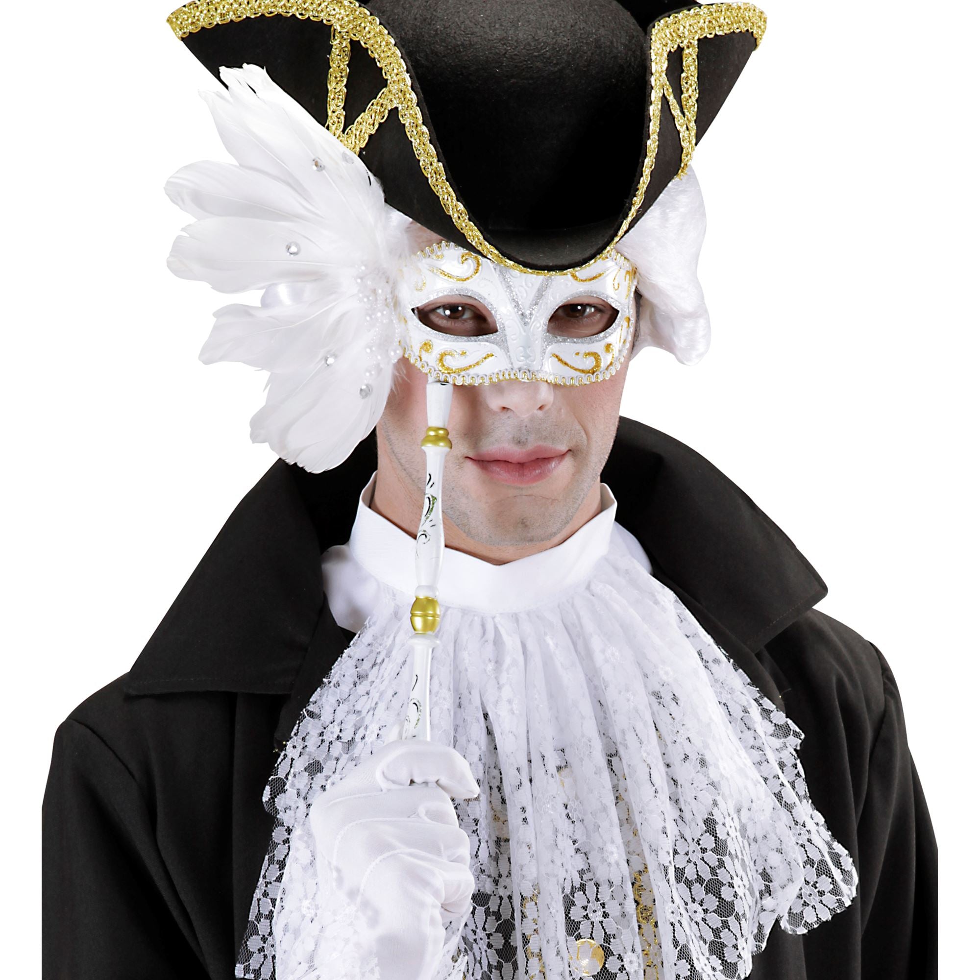 Ajoutez une touche d’élégance intemporelle à votre tenue avec ce loup vénitien baroque face à main, inspiré des célèbres mascarades de Venise. Doté d’un bâtonnet raffiné pour une prise en main confortable, ce masque se distingue par ses plumes majestueuses et ses détails scintillants qui apportent un éclat spectaculaire à votre look.