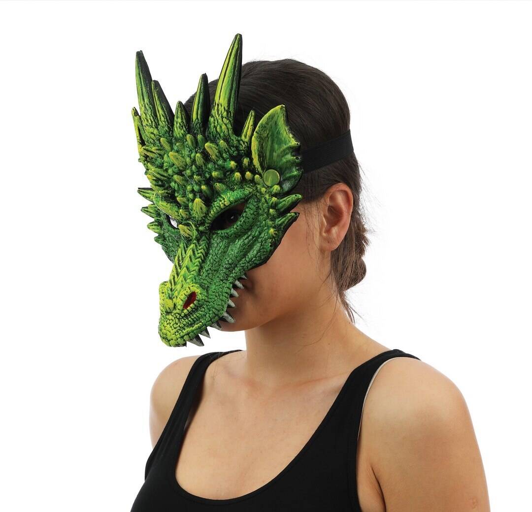 Demi-masque dragon vert souple et confortable. Parfait pour Halloween, soirées déguisées, carnaval ou cosplay fantastique. Achetez-le dès maintenant !