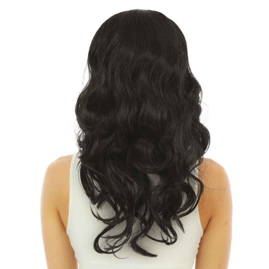 Perruque longue bouclée sans frange avec calot élastique. Accessoire idéal pour compléter un déguisement élégant. Achetez-la dès maintenant sur notre site web.